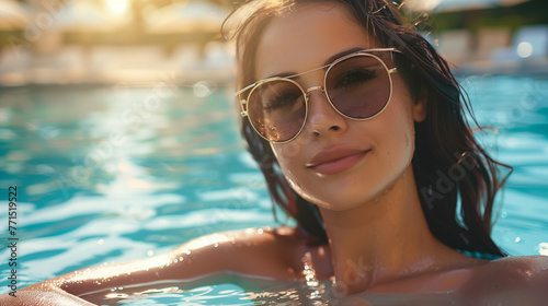 Woman wearing sunglasses in outdoor pool