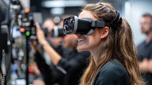 woman wearing virtual reality headset in modern tech lab, smiling with excitement