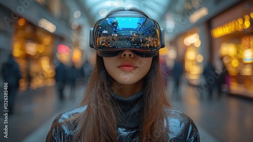 Woman wearing VR headset in shopping mall.