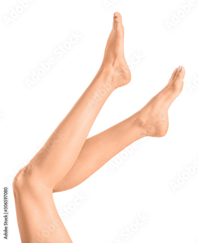 Woman with beautiful legs after depilation on white background
