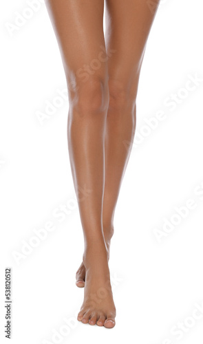 Woman with beautiful long legs on white background, closeup
