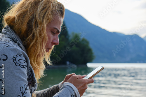 Woman with curly blonde hair types and focuses on her phone near lake Wolfgang, Austria, in the evening. Side profile, communication, social media, texting, message.