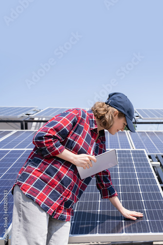 Woman with digital tablet touching solar panel