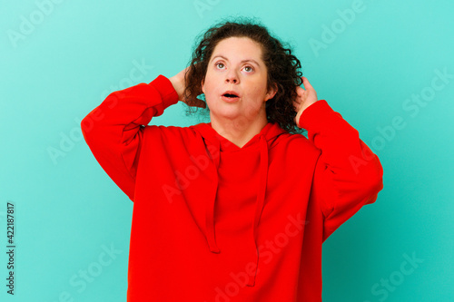 Woman with Down syndrome isolated screaming, very excited, passionate, satisfied with something.