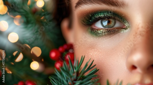 Woman with emerald green Christmas makeup, metallic green eyeshadow blended with gold, long dark lashes, natural skin with dewy finish, small pine branch and red berry props near face