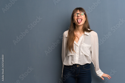 Woman with glasses over blue wall showing tongue at the camera having funny look