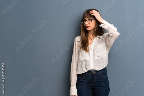 Woman with glasses over blue wall with surprise and shocked facial expression
