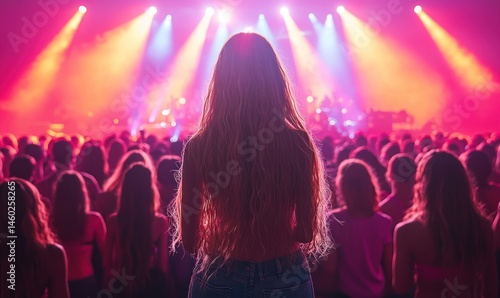 Woman with long hair facing a vibrant concert stage, bathed in colorful stage lights, amidst a large crowd of people