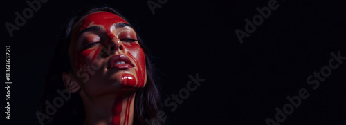 Woman with red face coloring on black back. For designers: ideal for futuristic projects, covers and advertising. For banners, posters, backgrounds. Spa and cosmetology, self-care. With copy space