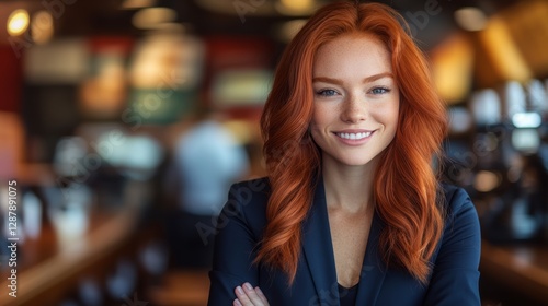Woman with red hair is smiling and posing for a picture. She is wearing a black jacket and has her arms crossed. The image has a warm and friendly vibe, with the woman's smile