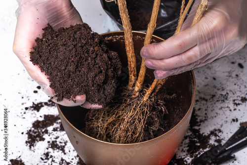 Woman woman perches Chinese rose - hibiscus in a pot with fresh fertile soil - close-up