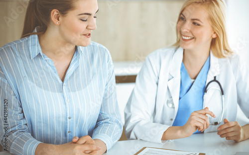 Woman-doctor and patient sitting and talking in sunny clinic. Blonde therapist is cheerfully smiling