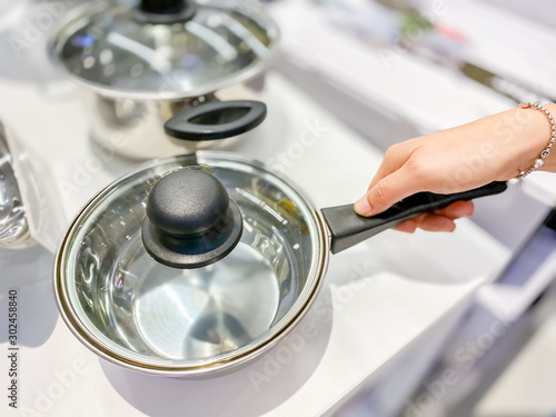 Woman's hand choosing and buy stainless steel pot in the shop industry backgrounds