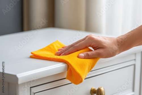 Woman's Hand Wiping White Cabinet: Protecting Home Surfaces from Germs with Microfiber Cloth