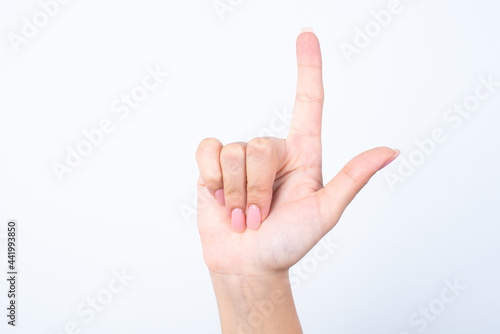 Woman's hand with pink manicure over isolated white background pointing aside with forefinger or imitating a gunfire.