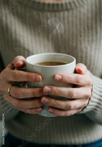 Woman's hands holding a hot drink in a cozy setting.