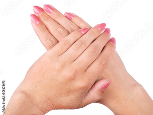 Woman's hands with pink nails manicure Isolated on white background.