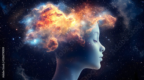 Womans head silhouette with a colorful nebula and cosmic elements in the background