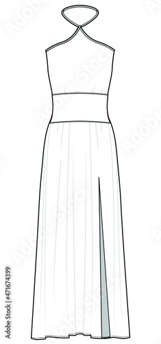 women halter neck sleeveless dress with front slit open. party wear dress vector illustration isolated on white background. CAD mockup