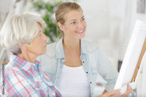 women hanging a picture frame on the wall