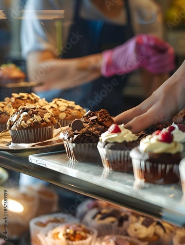 Women putting muffins on display in bakery shop, close-up
