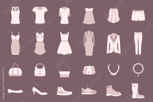 Women's clothing Icons set - Vector color symbols of dress, shoes, skirt, jeans, jacket and accessories for the site or interface