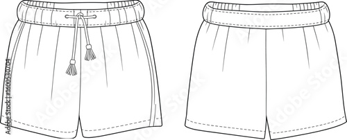 Women’s drawstring shorts technical flat vector, elastic waistband, front and back view, summer fashion apparel cad drawing illustration