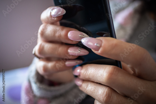Women's hands with manicured nails holds smartphone