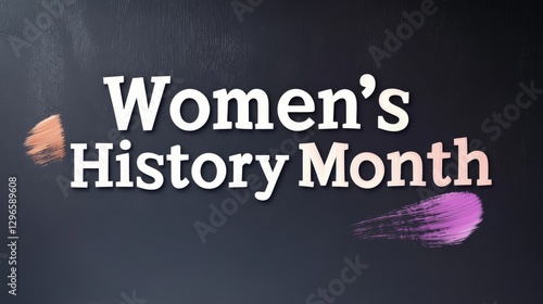 "Women's History Month" in white text on a black background with purple and pink brush strokes, symbolizing empowerment, equality, and the celebration of women’s achievements.