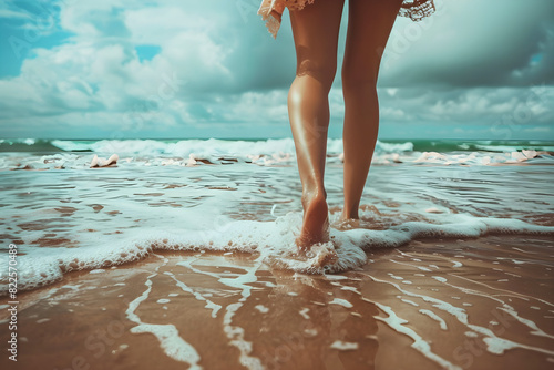 Women's legs on the beach near the sea, travel concept, human enhanced.