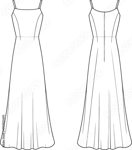 Women's long dress technical sketch, front and back view, thin straps, flared skirt, fashion flat drawing, garment construction, vector apparel template