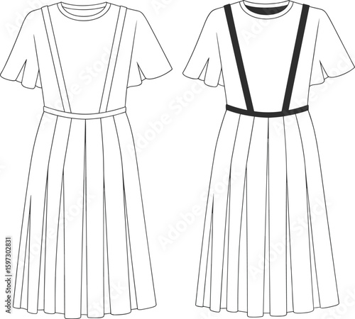 Women's Pleated Dress with Straps Technical Fashion Illustration Flat Sketch Template, Apparel Clothing Design Blank Mockup Front and Back View, Modern Midi Style.