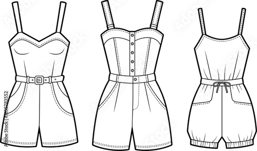 Women's romper cad drawing, flat fashion sketch, jumpsuit design template, vector outline illustration, sewing pattern, technical apparel sketch