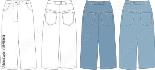 Women's wide leg denim pants front and back flat sketch, technical CAD drawing, vector fashion template for garment production and design