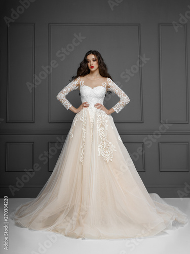 wonderful bride with long hair, elegant make-up, posing in studio, wiwaist, isolated on a grey background.