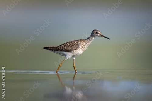 Wood sandpiper bird Triga glareola walking in shallow water