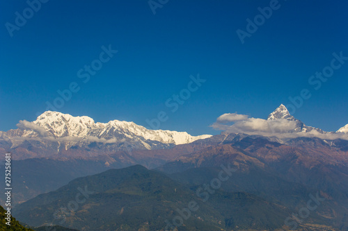 wooded hillsides in a mountain misty valley with snowy peaks of the Annapurna Ridge with white clouds under a clear blue sky