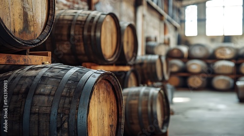 Wooden barrels in a distillery warehouse. Concept of aging, craft, and alcoholic beverages.