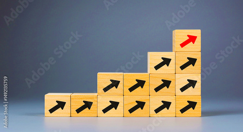 Wooden blocks arranged in a staircase pattern with arrows pointing upwards and one red arrow block