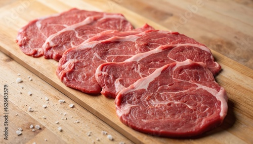 Wooden board divided into four sections, white and red. Steak or roast in center, surrounded by white crystals on wooden surface. Close-up of raw meat on kitchen cutting board.