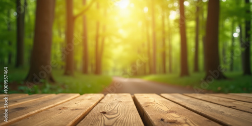 Wooden boardwalk path in summer forest, warm light, peaceful nature scene. Spring, summer, tranquil background image.