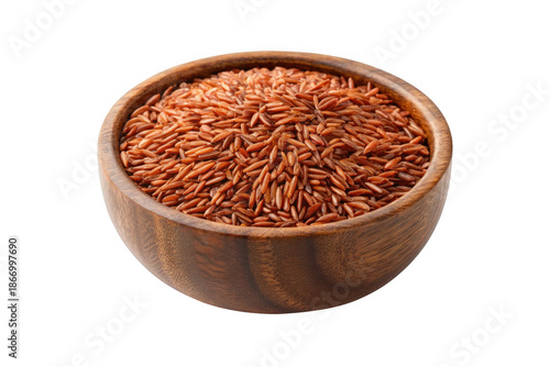 Wooden bowl filled with uncooked red rice isolated on transparent background