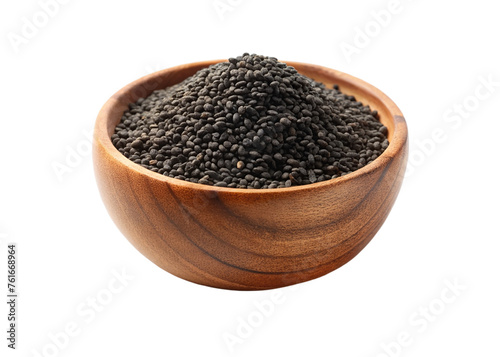Wooden bowl of black sesame seeds. isolated on transparent background.