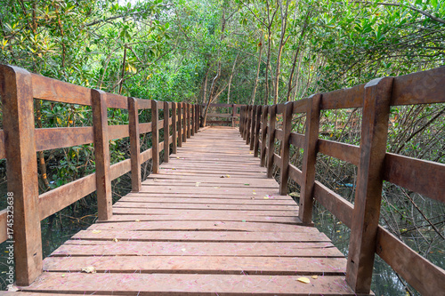 Wooden bridge, mangroves in India, rhizophora mangle red mangrove forest, coastal ecosystem, monsoon and rainforest vegetation, shallow water