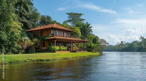 Wooden bungalow nestled on the riverbank offers a serene escape. Lush nature surrounds while comfortable chairs invite relaxation under the soft glow of sunset