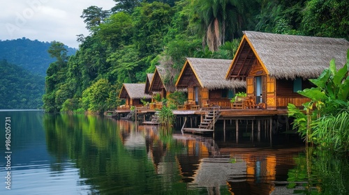 Wooden bungalows on stilts over a calm lake surrounded by lush tropical vegetation.