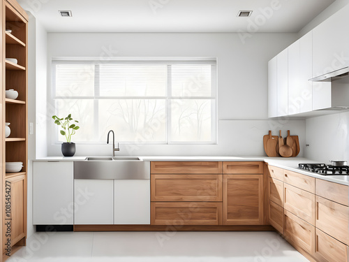 Wooden cabinets in bright minimal white kitchen interior with window.