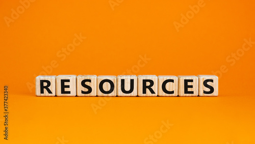 Wooden cubes with word 'resources'. Beautiful orange background. Business concept. Copy space.