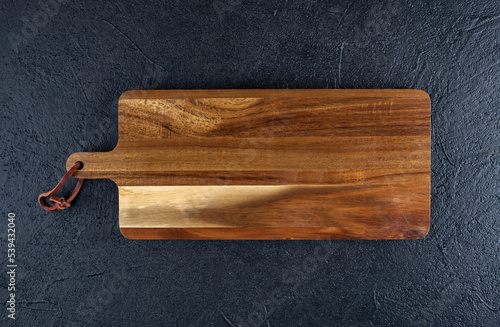 wooden cutting board on black wooden , copy spce