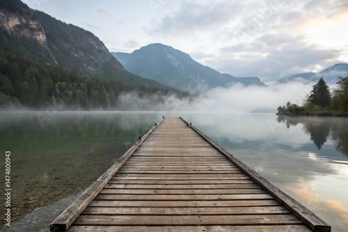 Wooden Dock Extending into Calm Misty Mountain Lake - generatde by ai